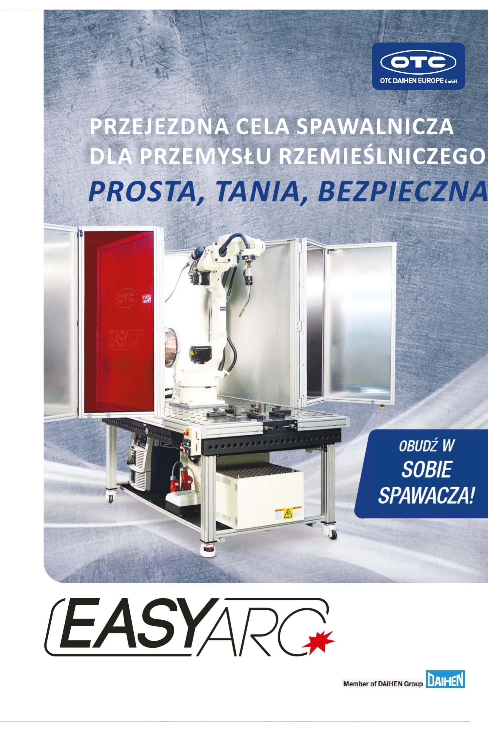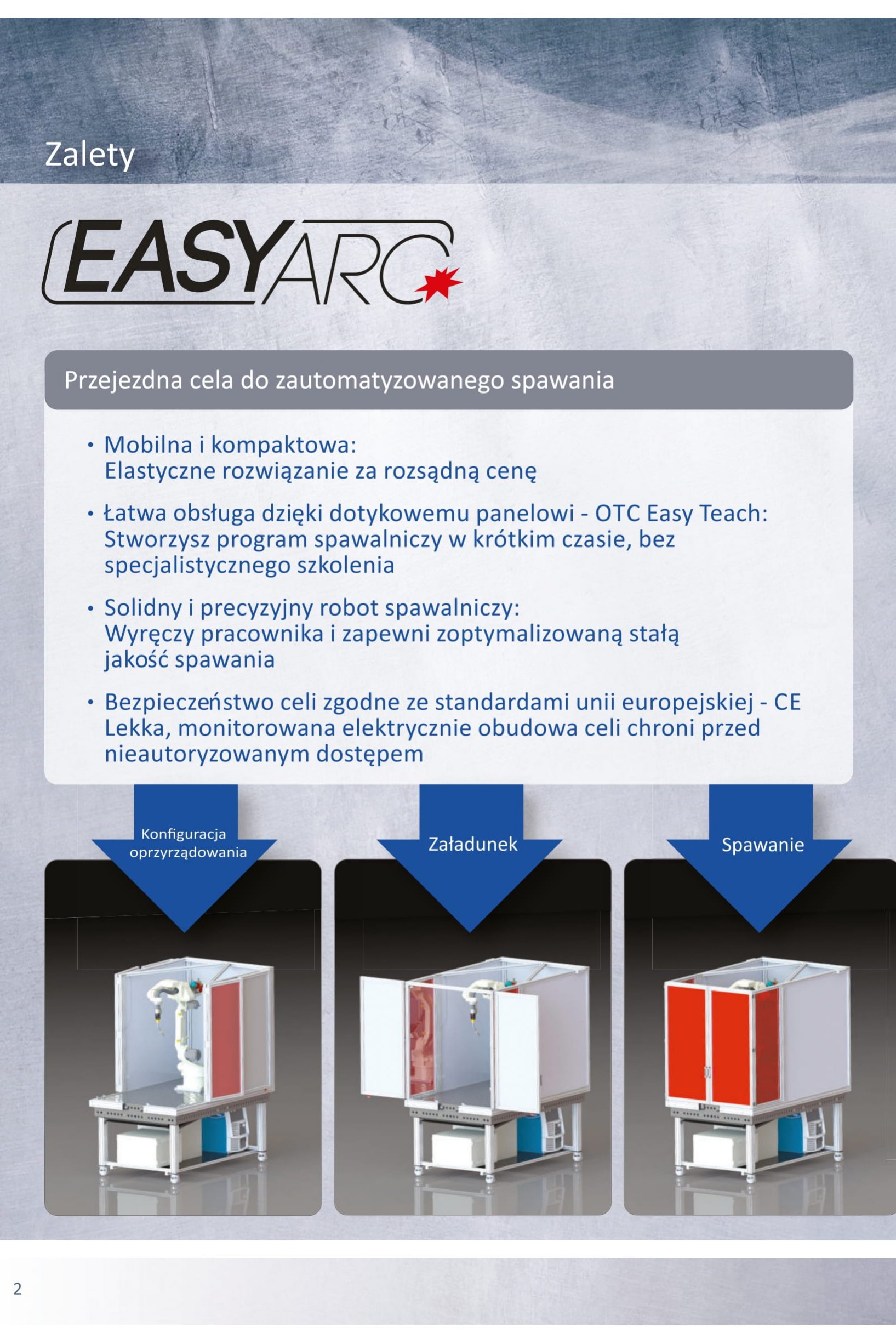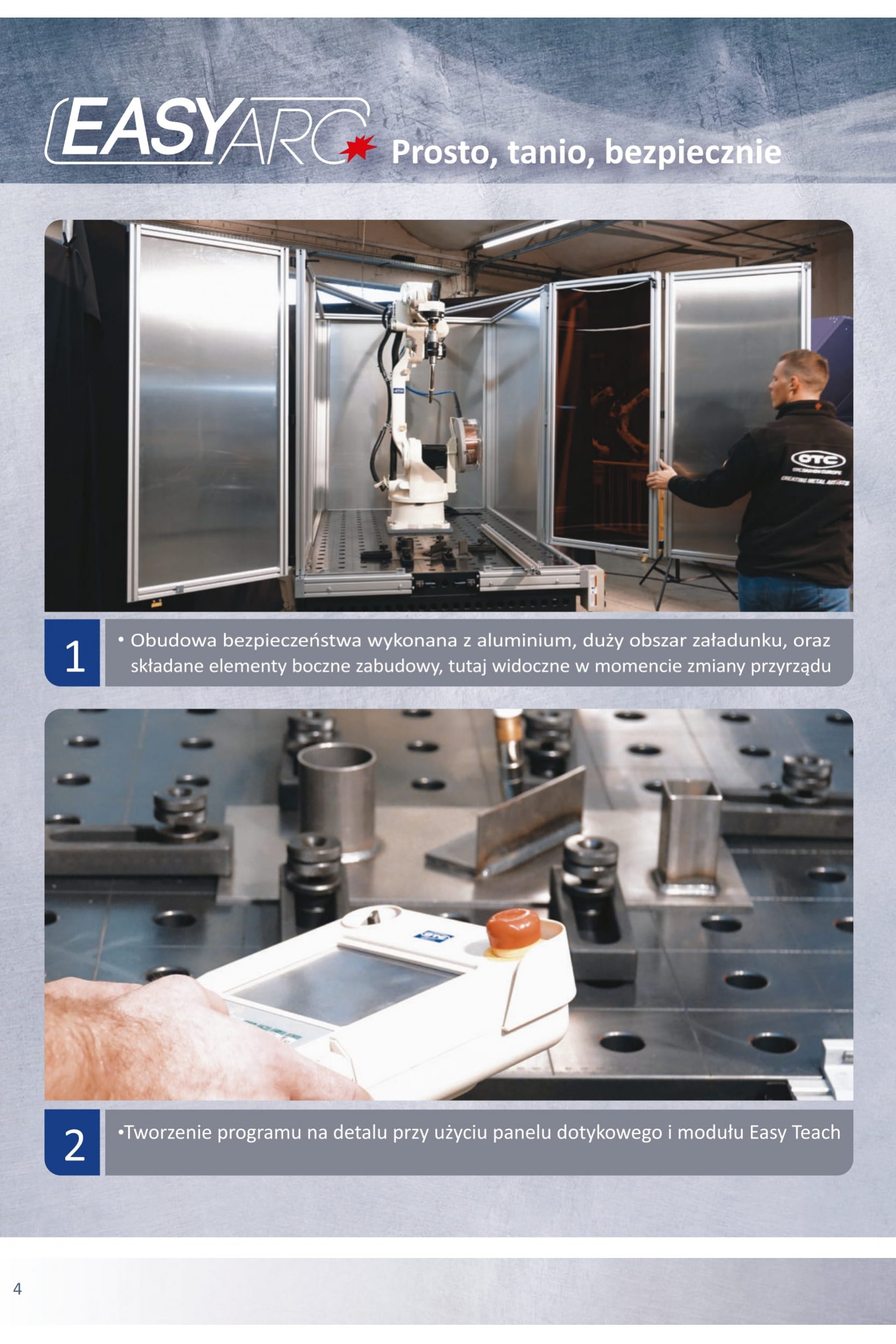 EASY ARC obejmuje kompaktowego robota spawalniczego z intuicyjnym sterowaniem OTC Easy-Teach, który zapewnia operatorowi perfekcyjne spoiny dzięki zintegrowanemu systemowi eksperckiemu i własnemu falownikowi źródła zasilania MIG/MAG 400 A producenta.