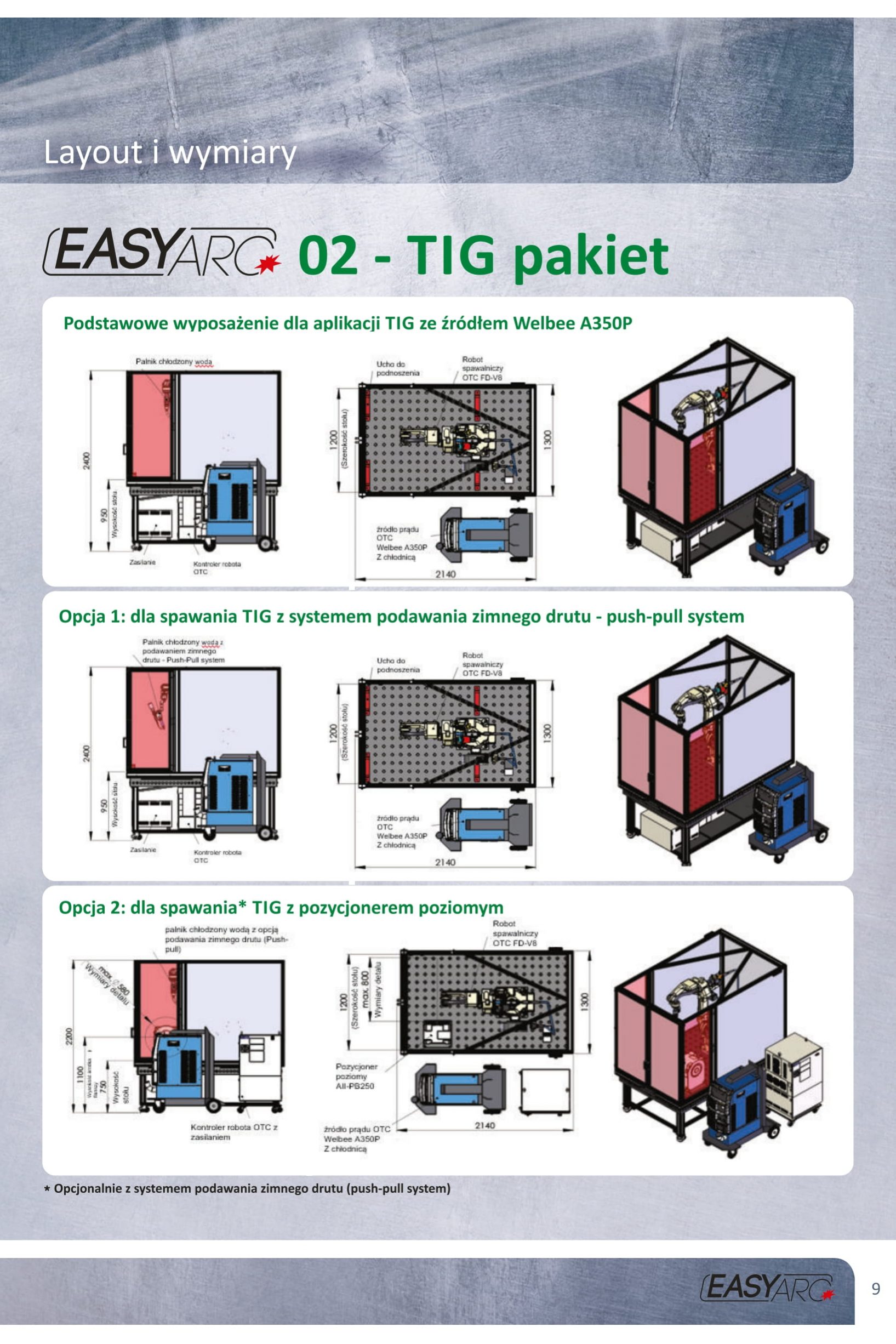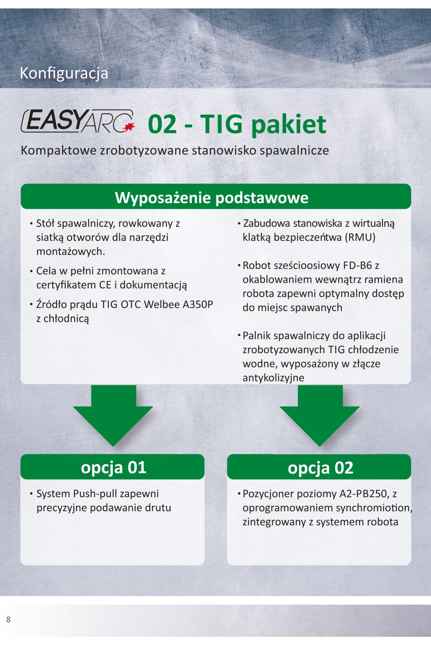Opcjonalnie Easy ARC można wyposażyć we w pełni zintegrowany pozycjoner poziomy (do 250 kg udźwigu), aby umożliwić obracanie elementu nawet podczas spawania. Ponadto dostępne są wersje do spawania metodą TIG z drutem zimnym i bez drutu zimnego.